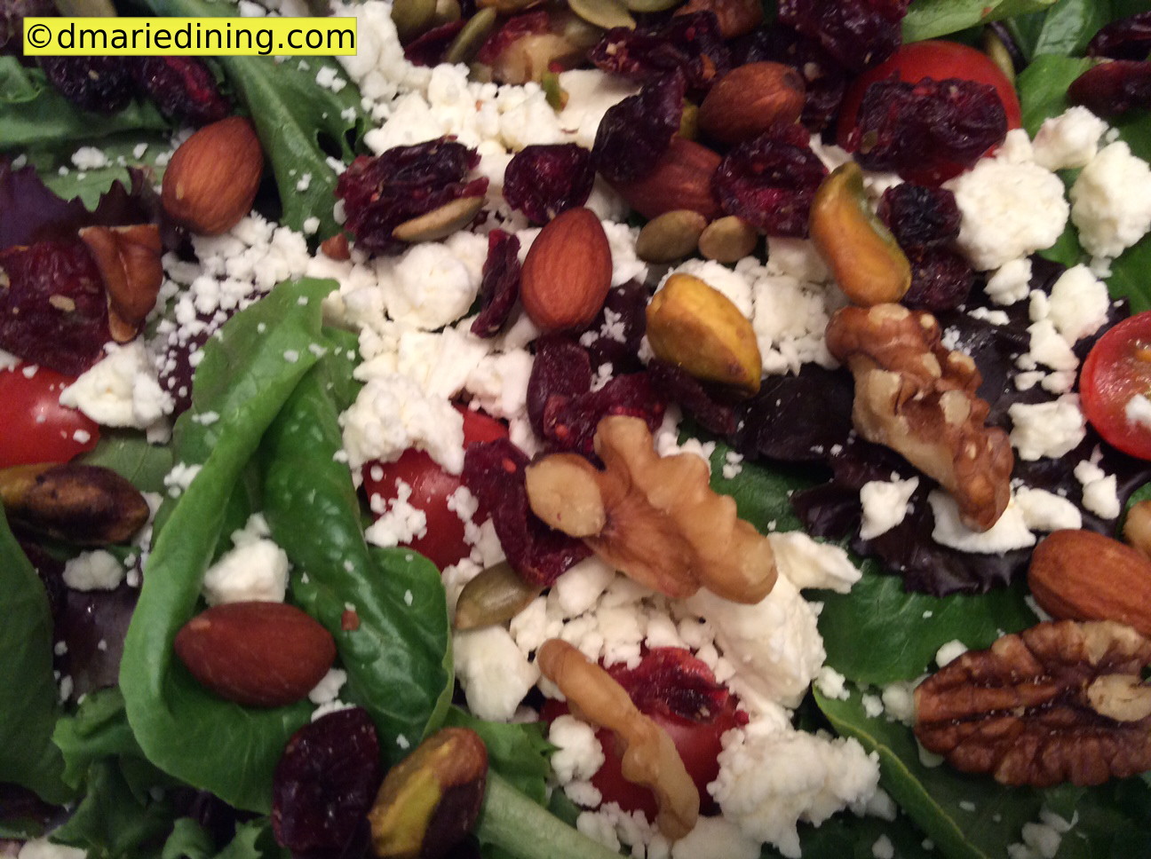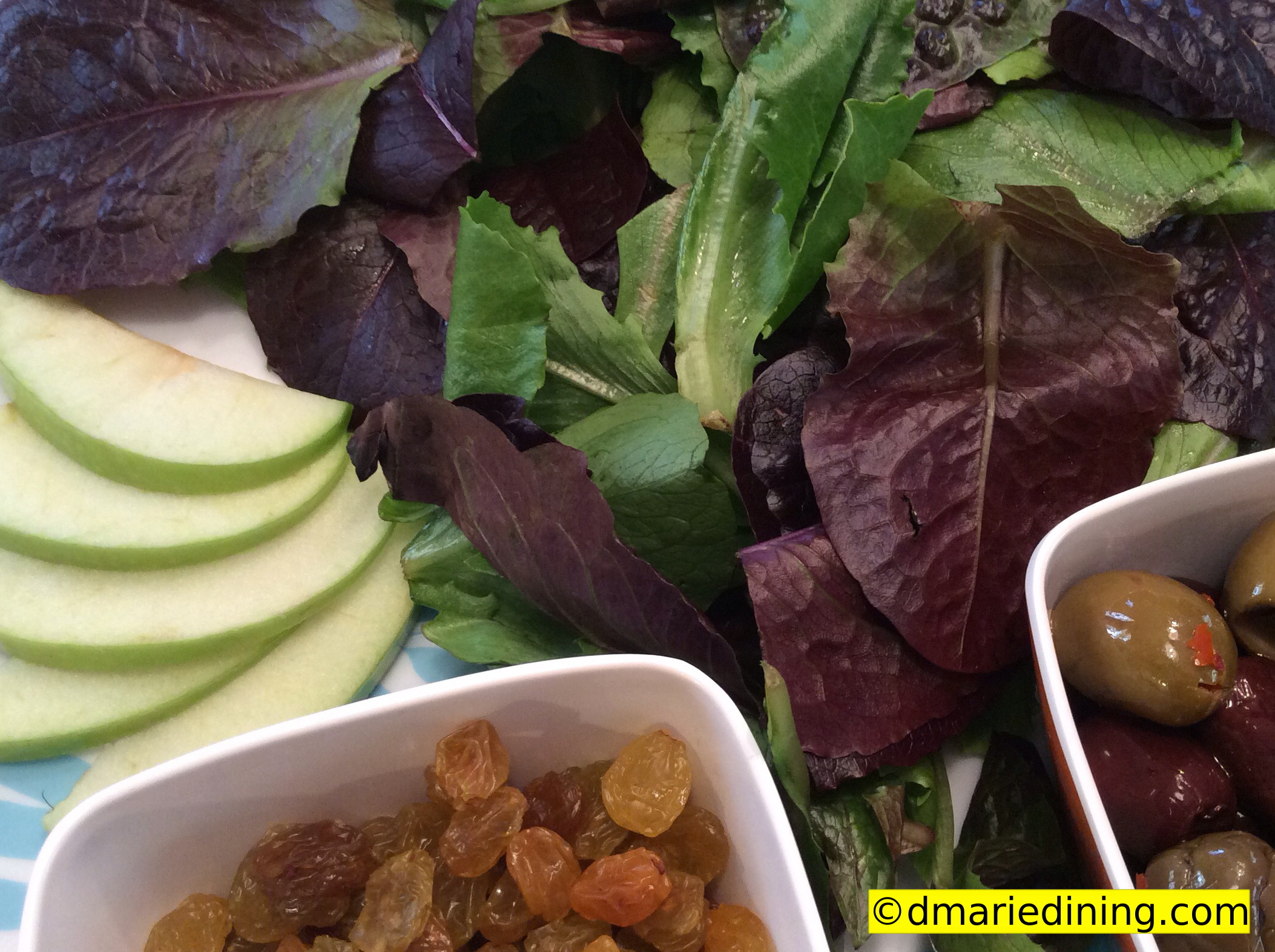 On nights I do not have to cook for the family I will make a Big Salad and load it up with whatever I can find in the fruit bowl or refrigerator. Apples, dried cranberries, golden raisins, nuts and olives are a household staple so that is the base of most of the salads I make. Because my son only likes iceberg lettuce and my husband and I like mixed greens, I usually keep both on hand. Sometimes I mix various types of lettuce to keep things festive.
