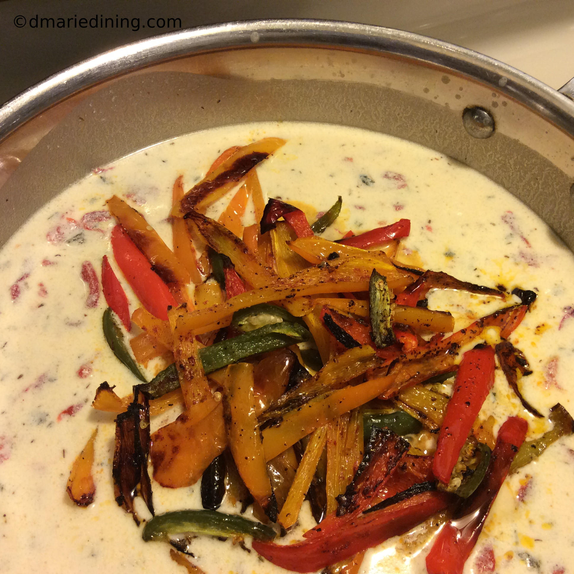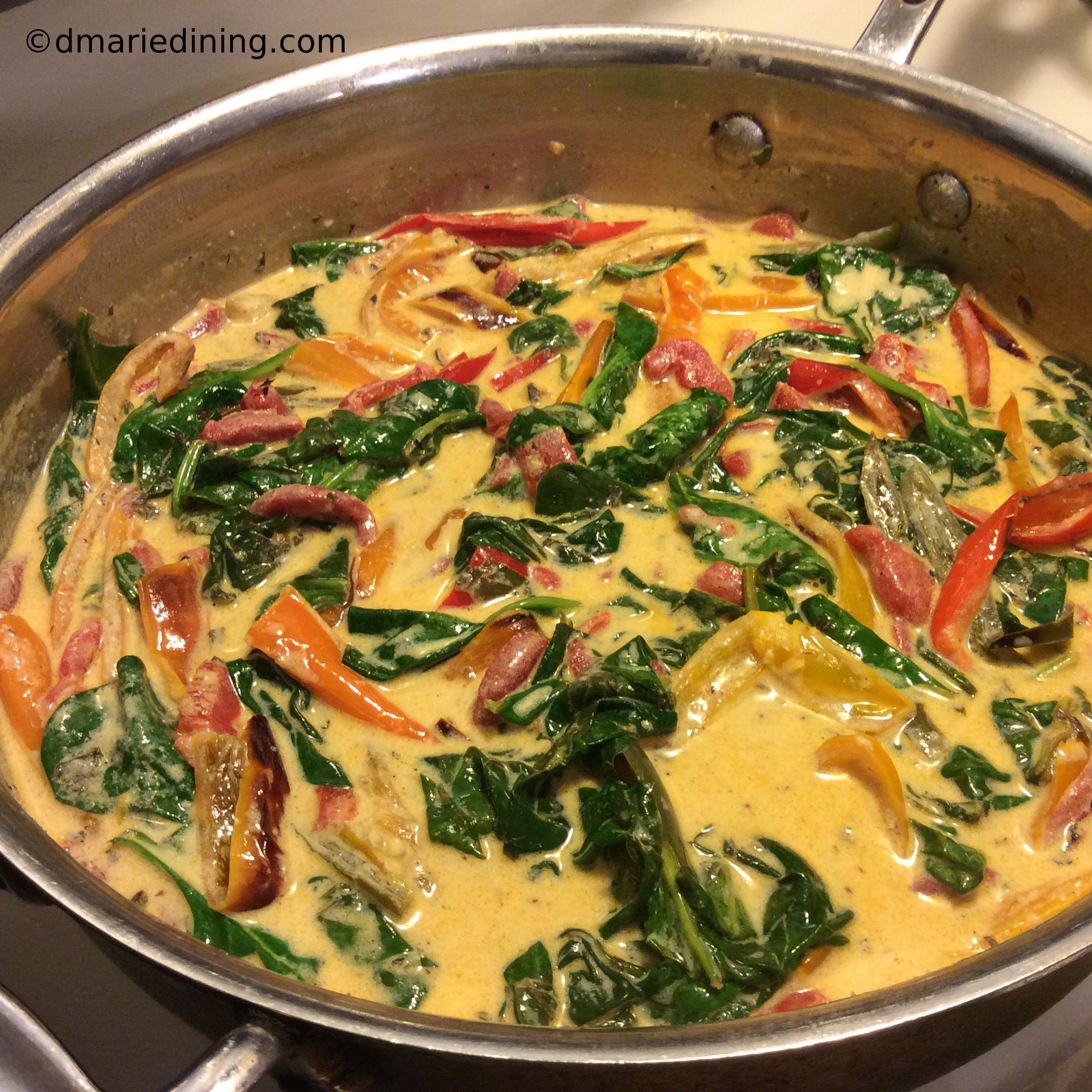 Melt 1 tbsp butter in a large frying pan along with olive oil over medium high heat. Add garlic and saute for 1 minute stirring constantly. Reduce heat to medium then pour in heavy cream along with half and half and starchy water. Simmer for 2 minutes then add sauteed peppers, capers, parsley, lemon juice, lemon zest and remaining seasonings. Stir to blend. Add spinach and let it wilt. Once spinach wilts stir in pasta to coat with sauce.
