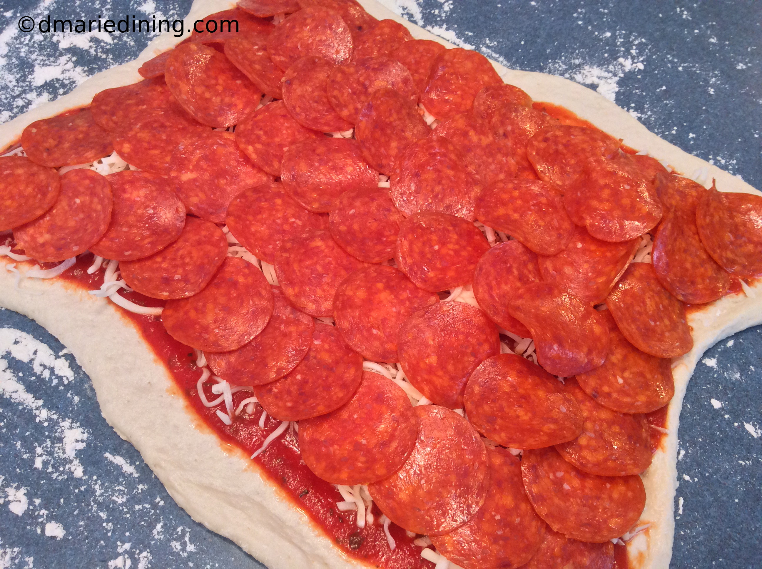 Sprinkle flour on a clean flat surface. Place pizza dough on flour and using a floured rolling pin roll out the dough slightly. Spread pizza sauce evenly over the pizza dough leaving a ¼ inch boarder around the edges. Sprinkle mozzarella cheese over the sauce. Layer pepperoni over the cheese then sprinkle the fontina cheese over the pepperoni. Start at one end of the pizza dough and begin gently rolling it forward and try to keep it tight to create a log. If the dough is too sticky to handle, pat your hands with flour.