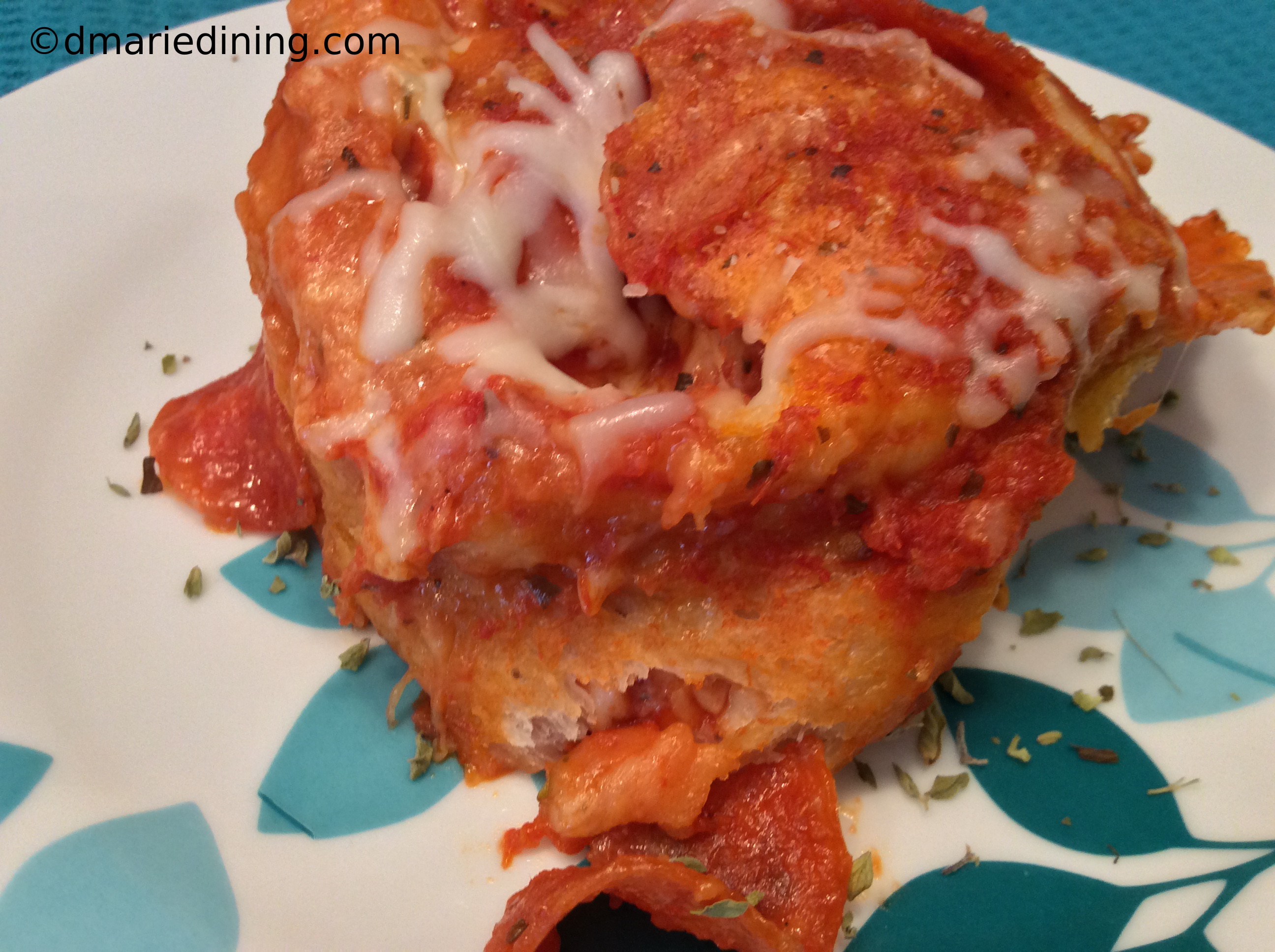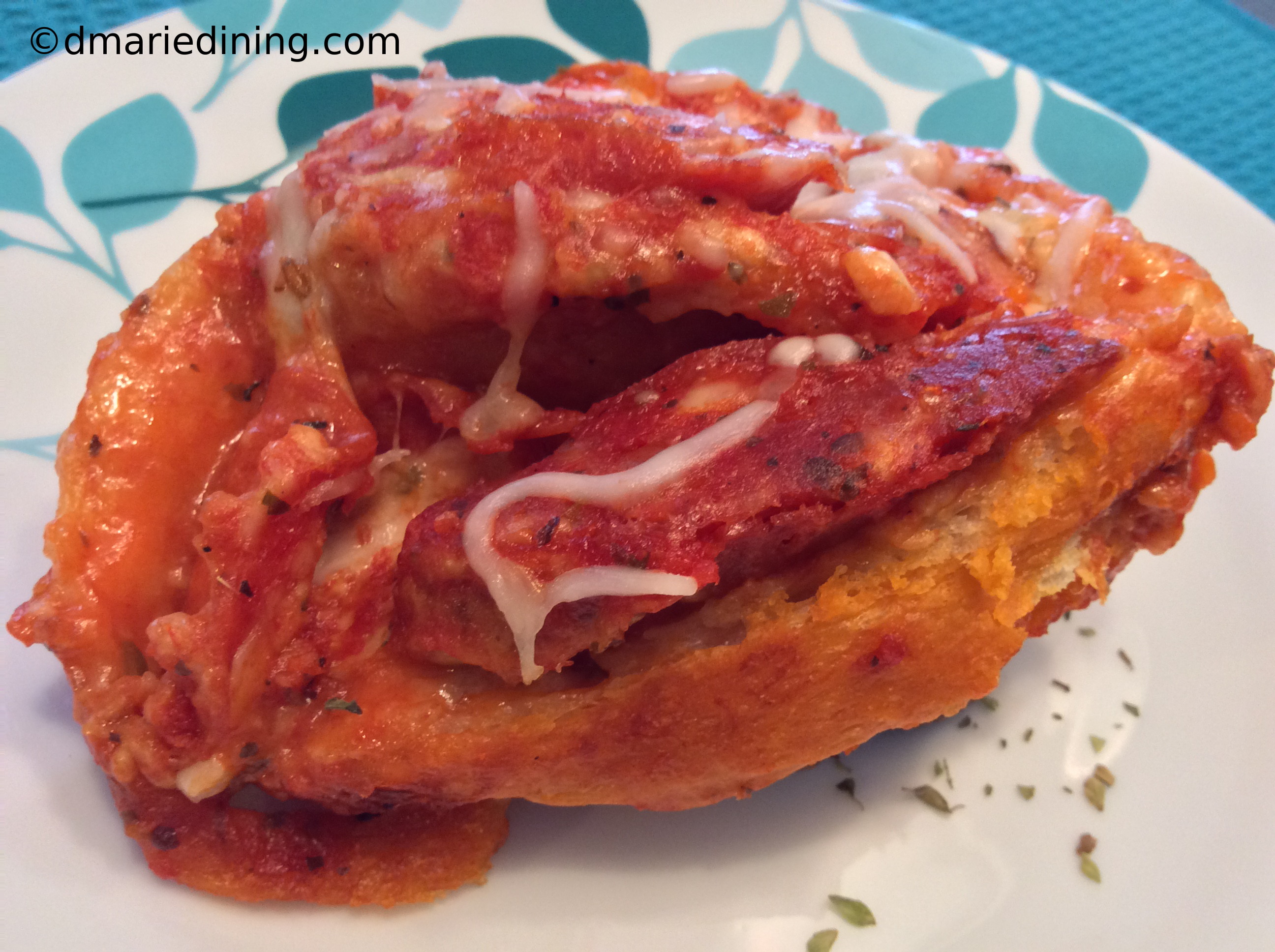 Of course when you think of pizza you think of pizza dough, sauce and cheese. Simple ingredients for a simple dish. I have to say that when I first pulled the Bizza (more on the name later) out of the oven it was not the prettiest of sights. Everything looked kind of mushed together but as I pulled each of the buns apart they started to look pretty good. The final test for whether or not I could post the recipe for a Bizza on dmariedining.com was in the taste. My hubby looked hesitant to try it and my youngest son just looked hungry. After my son took a bite he nodded his head (like a cool teenager would) and my hubby said it reminded him of a calzone which he loves. Score one for dmariedining.com!