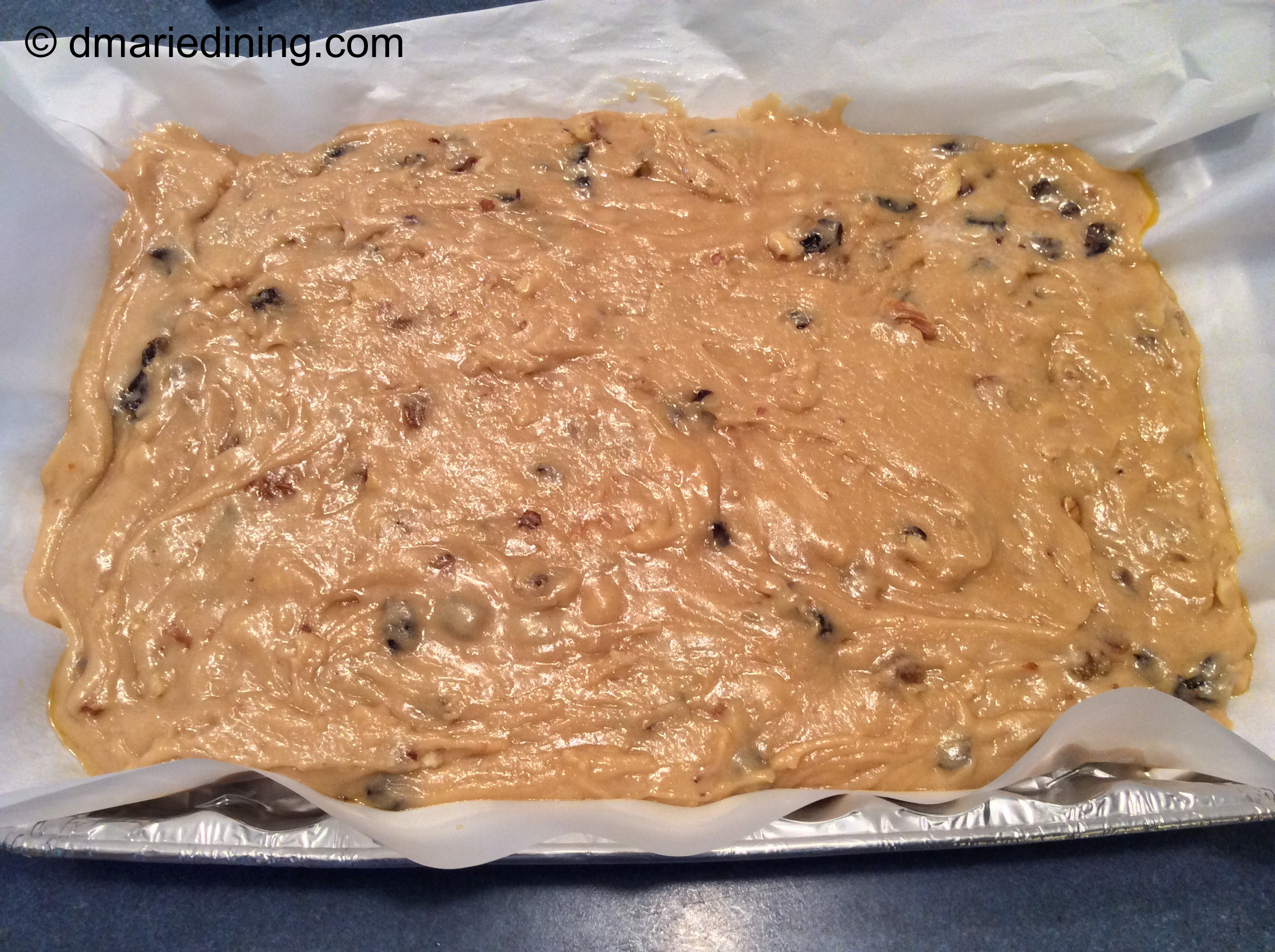 I have been searching for cookie recipes that were easy to make and included mascarpone cheese. I found a couple of recipes but changed my mind and decided to come up with a cookie bar that included nuts and dried fruit. I could try to say the nuts and fruit made the cookies healthier than a regular cookie but who would I be kidding!