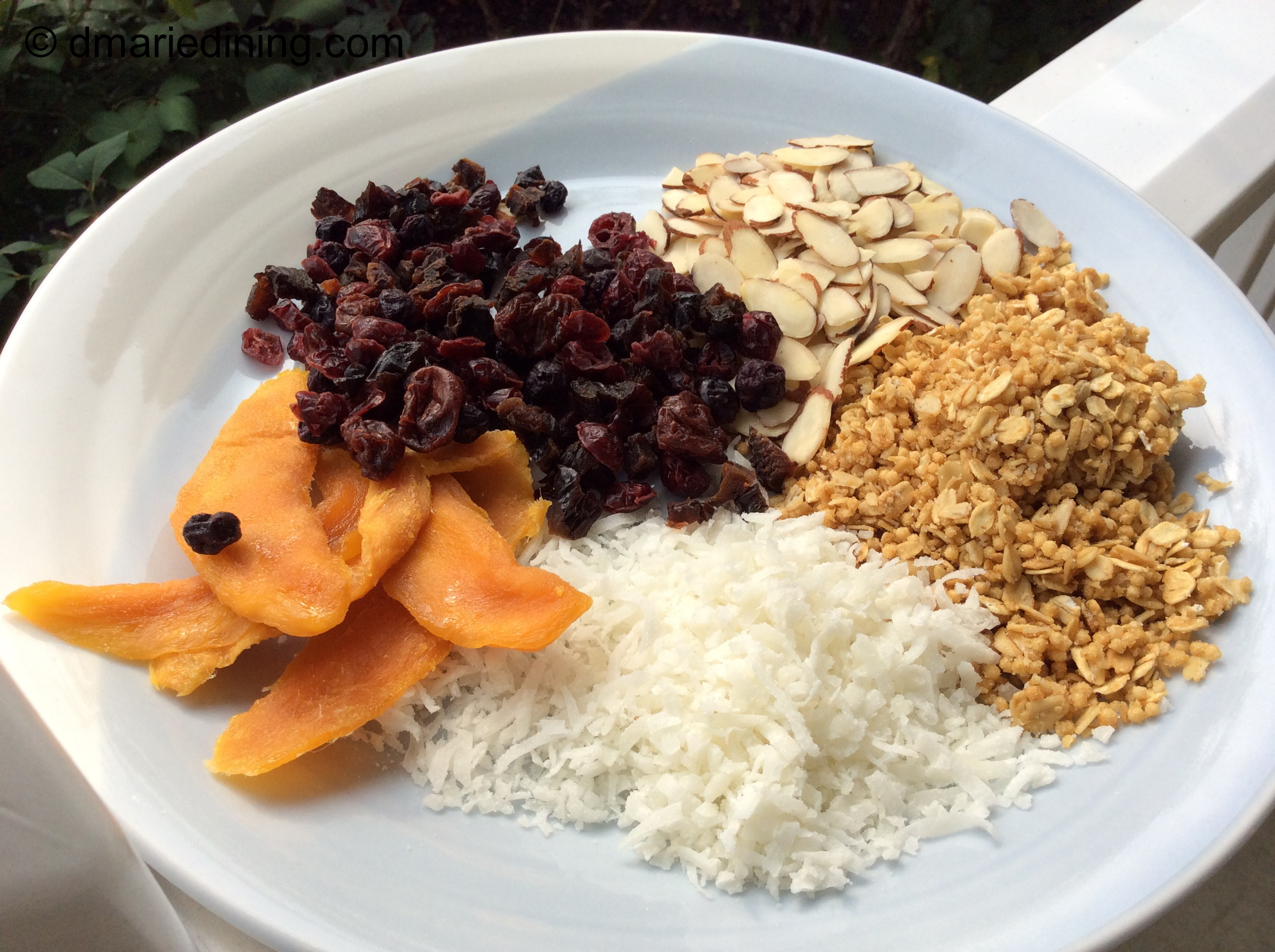 Naturally sweetened from the whipped honey I used along with the dried fruit, this easy treat satisfied my sweet tooth and kept me from feeling too guilty or bloated. I liked the nice crunch of the granola, toasted almonds and walnuts plus the chewiness of the dried plums, mango and cranberries. The whipped honey made it all sticky and fun to eat.
