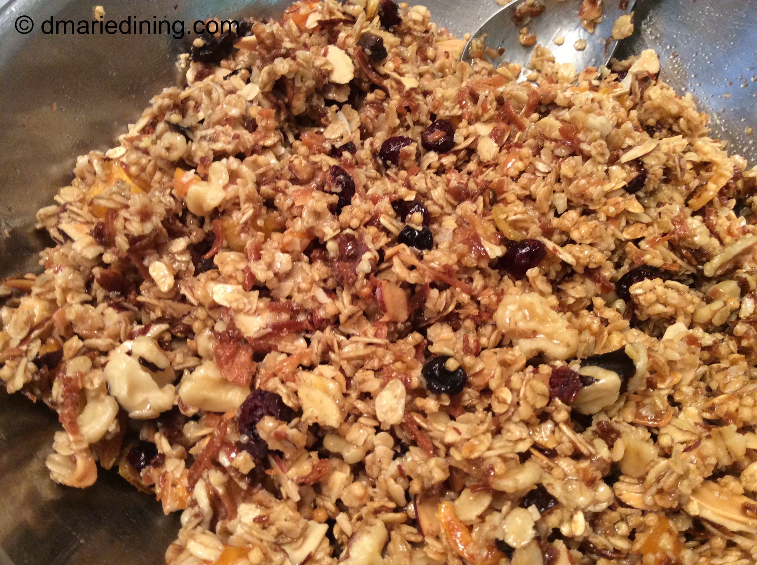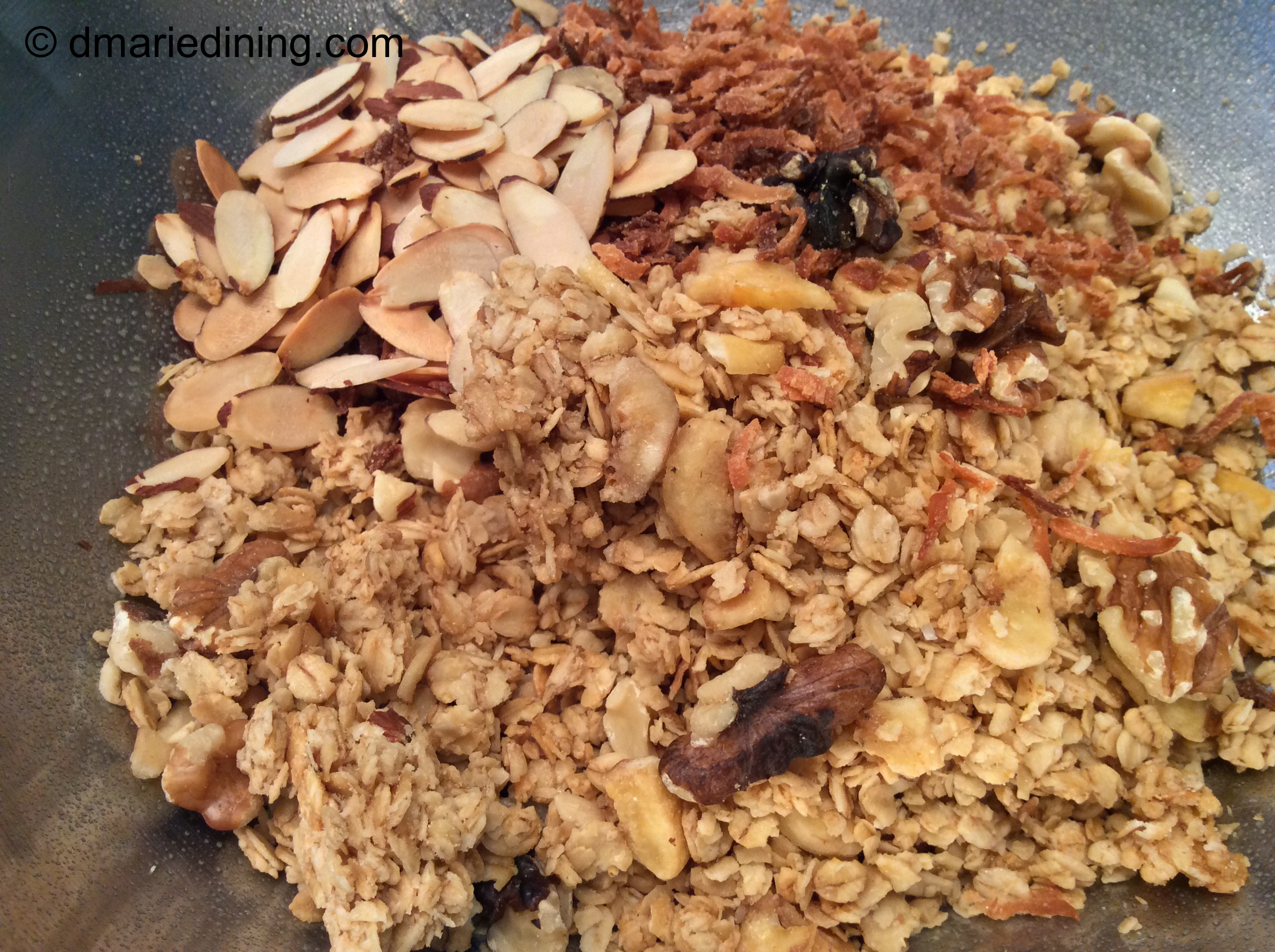 Place granola, cooled coconut, almonds and walnuts in a large bowl.