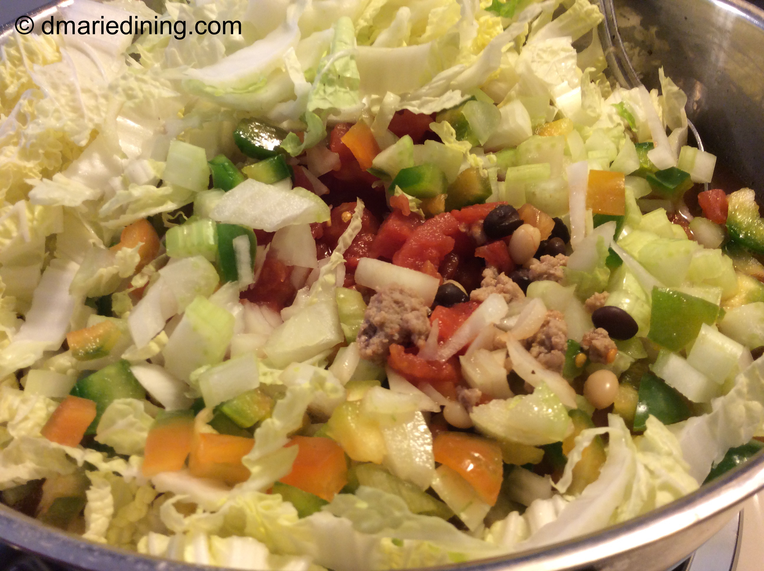 Brown ground turkey on medium high heat in a large pot. Season meat with salt, black pepper, onion powder and garlic powder. Add scallions, red and green peppers. Stir and reduce heat to medium. Cook for 3 -5 minutes. Add tomatoes, cabbage, water, beans and remaining seasonings. Stir and lower heat slightly. Simmer for 20 minutes.