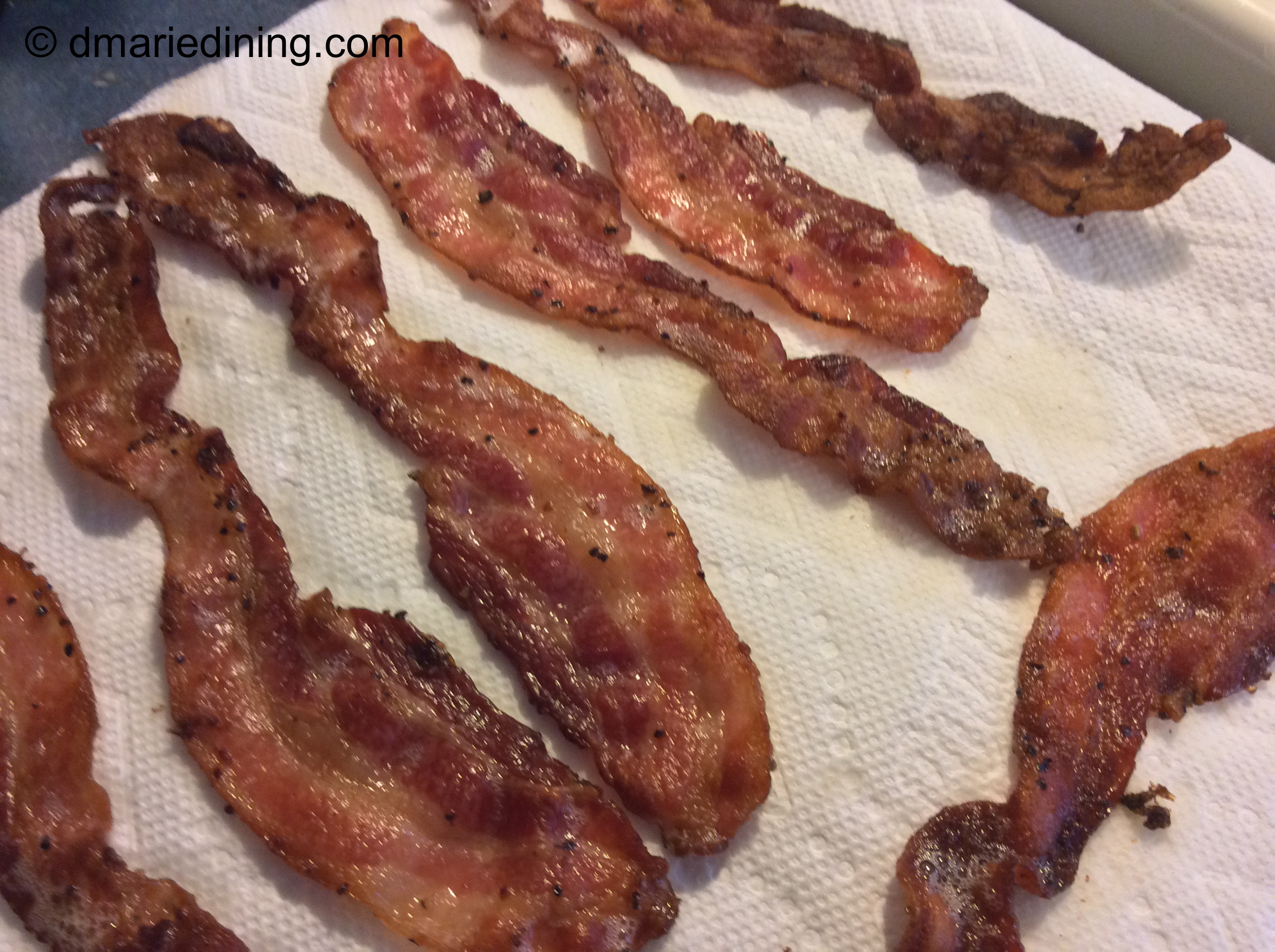 Place bacon on a microwave safe plate with a stack of 3 paper towels and cover with a paper towel. Microwave bacon for 4 ½ minutes until crispy. May need to adjust time based on your microwave. Set aside.