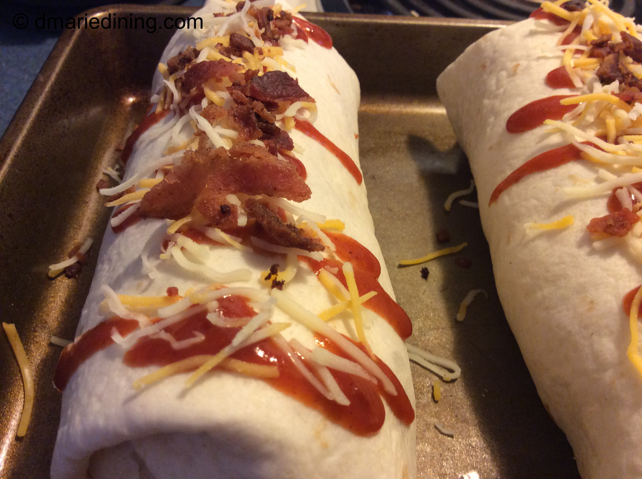 Lay a large tortilla on a flat surface. Spread a little cream cheese over the tortilla. This will act as a binding agent to keep the tortilla together when you roll it up. Place a spoonful of scrambled eggs at one end of the tortilla. Layer a little salsa over the egg then sprinkle shredded Colby Jack cheese over the salsa. Add two slices of bacon over the cheese. Fold the closest end of the tortilla over the filling then fold in the two sides. Roll the tortilla tucking in the sides as you go until you reach the other end of the tortilla. Place tortilla on a cookie sheet sprayed with cooking spray. Repeat with remaining tortillas. Bake the tortillas for 5 – 10 minutes to allow cheese to melt and the tortilla is warm.
