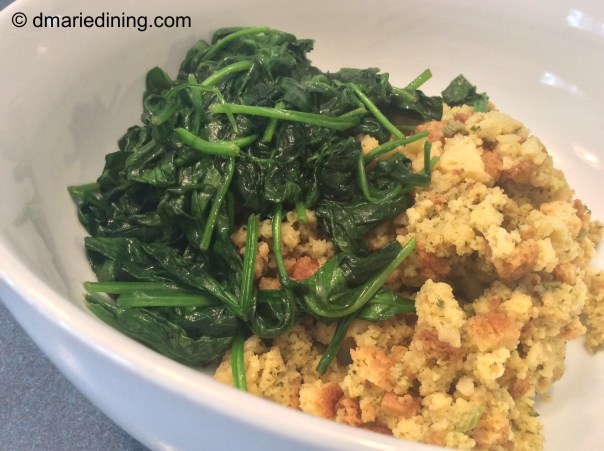 The reason I decided to make Stuffed Flounder was so I could use the rest of the cornbread stuffing we had the night before. Now, that our youngest son is in college I actually have leftovers. I don’t like wasting food so I try to find different ways to “re-purpose” the leftovers. Making a spinach and cornbread stuffing for the flounder seemed like a great idea.