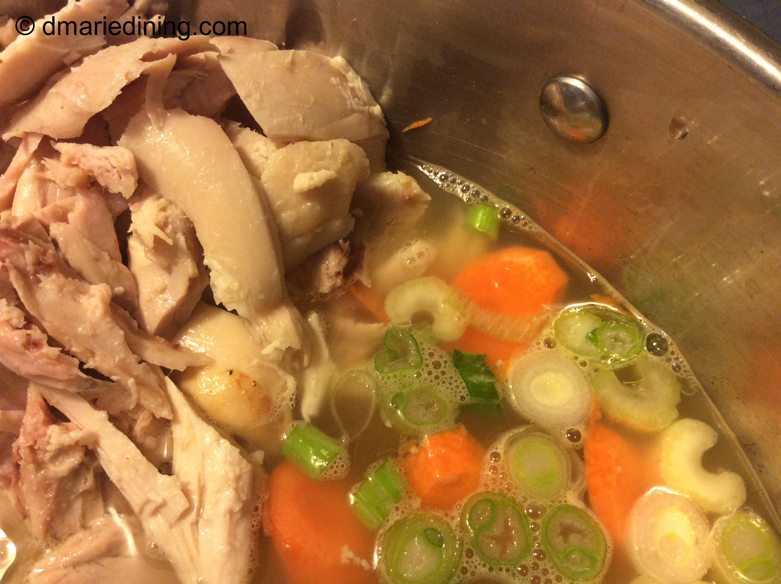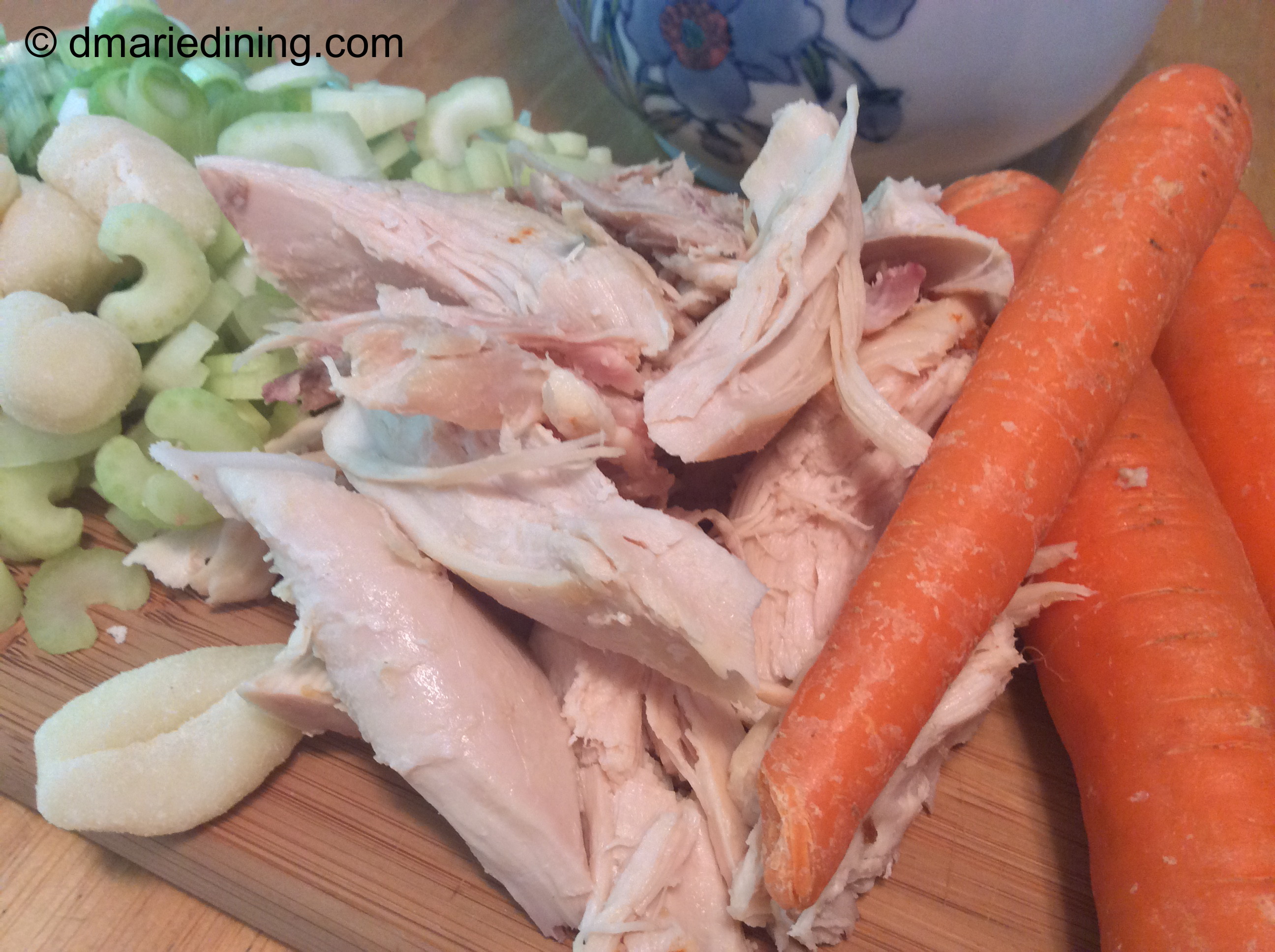 If using chicken breasts and chicken thighs, cook in 4 cups water with 1 tbsp salt for 25 – 30 minutes. Remove chicken from pot and let cool then remove skin and bones. Cut into bite-size pieces.