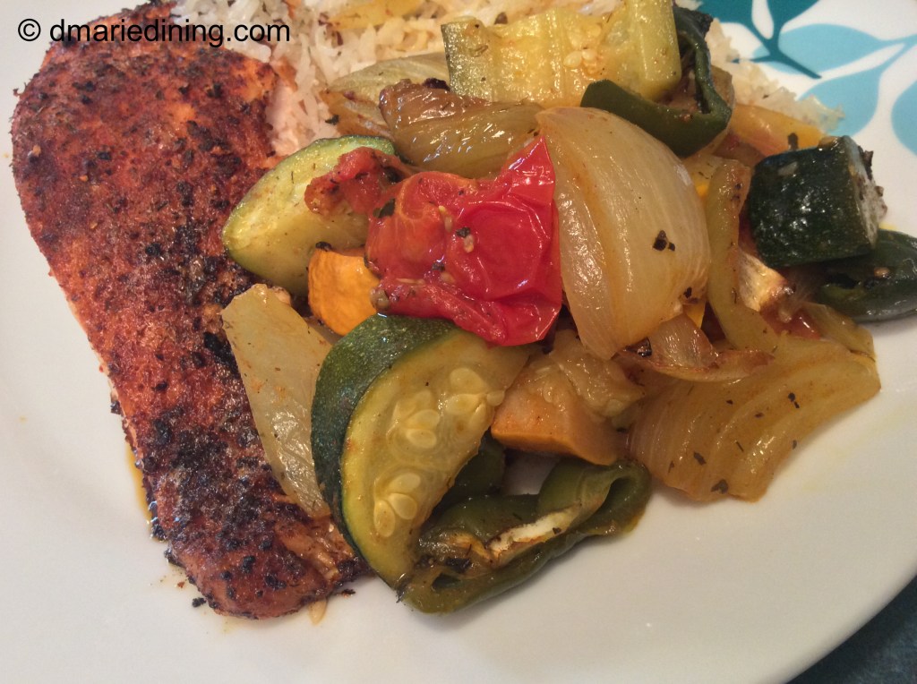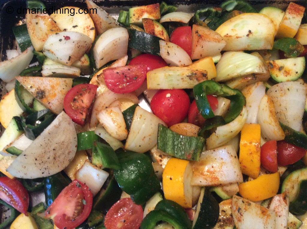 To pack a lot of flavor into one vegetable side dish I roasted zucchini, yellow squash, tomatoes, onions and peppers together. The prep time was quick and the end result was fantastic. Also, using a sheet pan to roast the vegetables kept clean up time down to a minimum.
