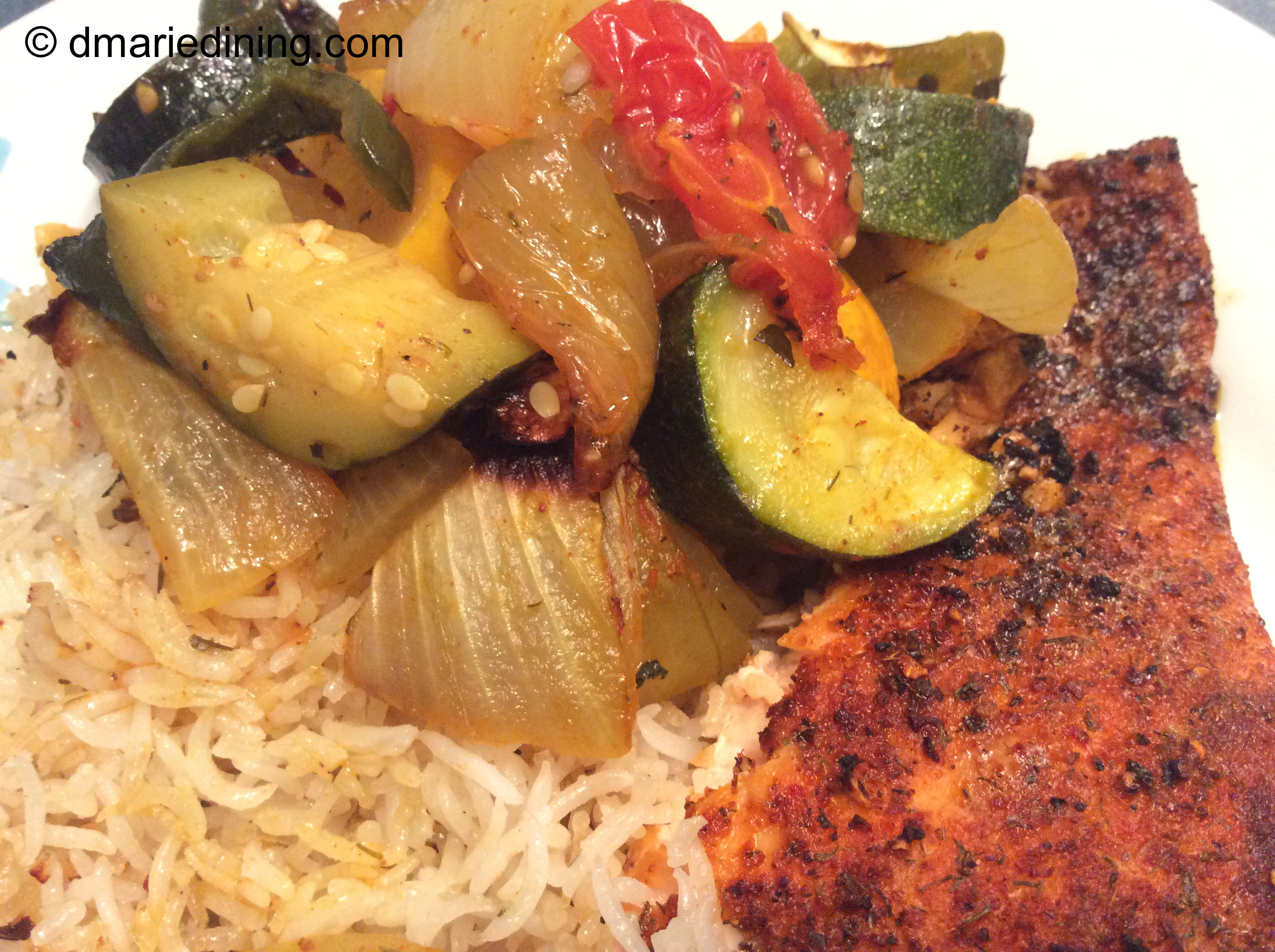 Spray a rimmed sheet pan with cooking spray then add the vegetables to the pan. Sprinkle with all of the seasonings then drizzle with extra virgin olive oil. Toss to mix and coat the vegetables. Place in the oven and bake for 30 to 40 minutes until the vegetables are soft and cooked to your desired tenderness. Serve with your favorite meat or over rice as a vegetarian meal.