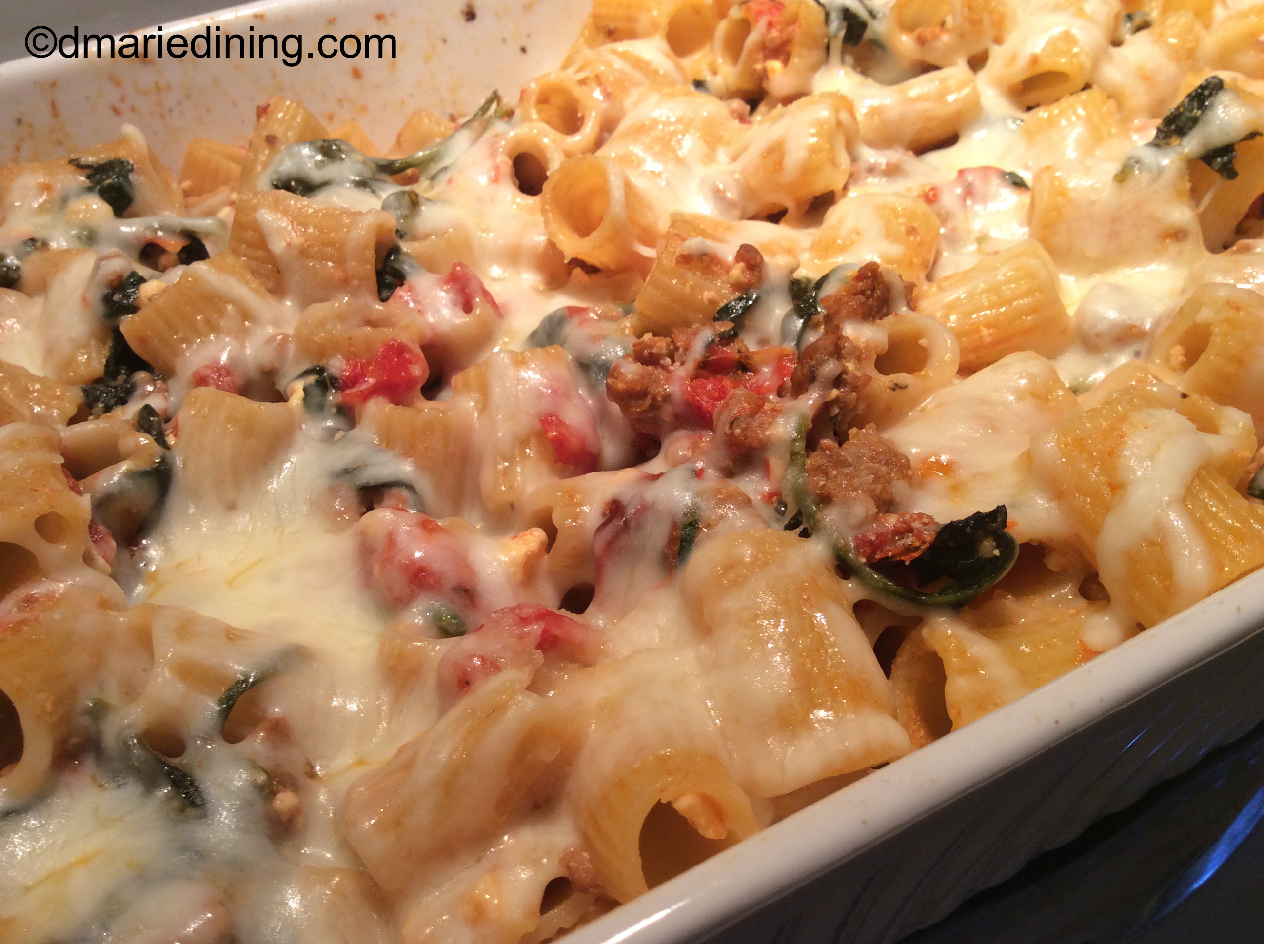 While the feta cheese and tomatoes are baking prepare pasta according to the package. Brown the sausage and drain on a paper towel then add to a bowl along with the spinach. Toss the two together and the heat from the sausage will wilt the spinach.