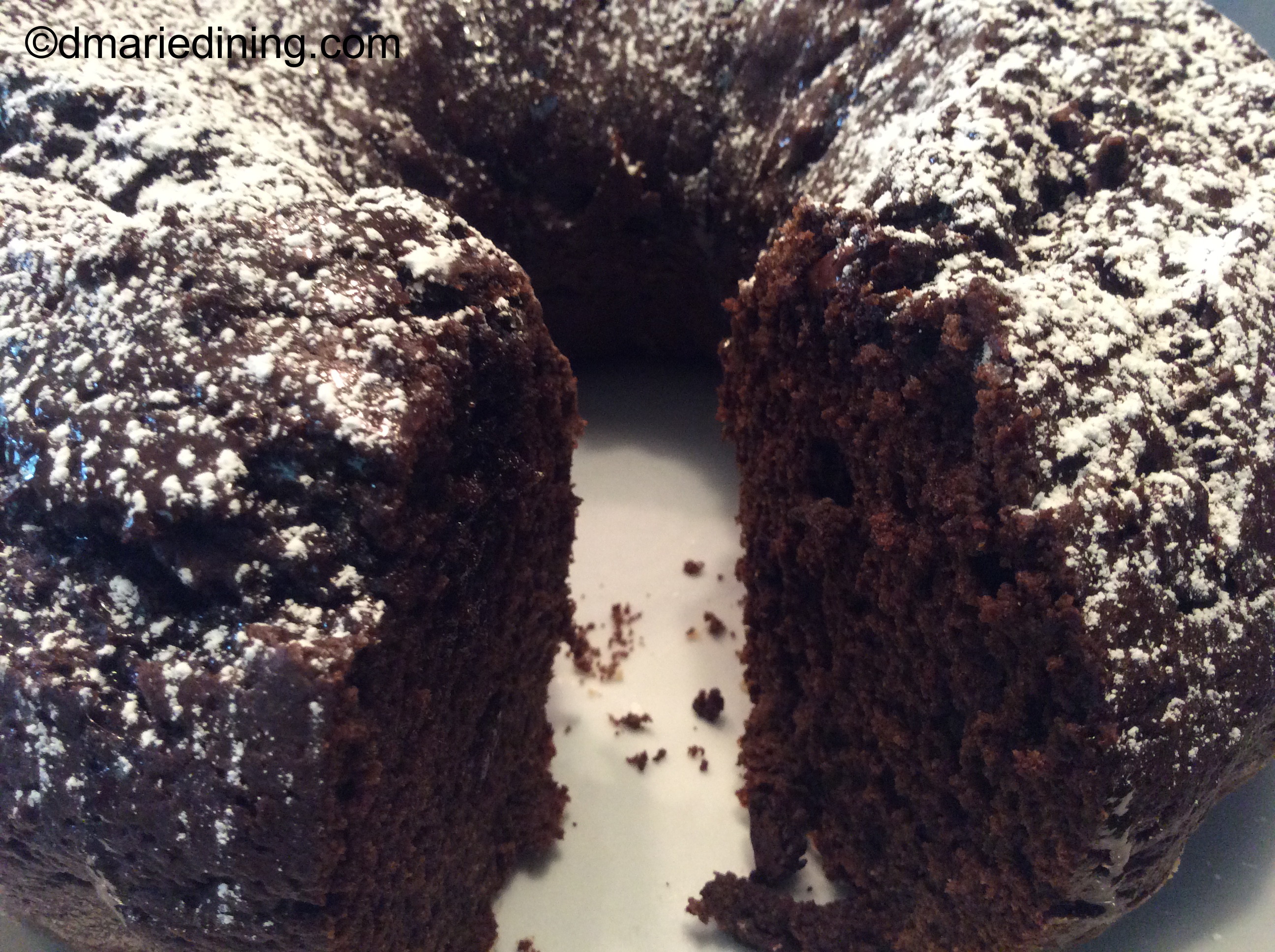 Preheat oven to 350 degrees. Grease and flour a 10” tube pan or Bundt cake pan. Set aside. In a large bowl mix together the cake mix, chocolate pudding, cinnamon, milk, oil, eggs and almond extract. Do not over beat! Fold in chocolate chips. Evenly pour batter into the cake pan. Lightly beat the bottom of the cake pan with your open palm to help release air bubbles. Bake for 50 to 60 minutes depending upon your oven. To test whether the cake is done insert a toothpick in the center of the cake. If the toothpick comes out clean, the cake is done. Cool the cake in the pan for about 10 minutes then flip onto a wire rack (flip so the top of the cake is showing) and let cool for 10 – 15 more minutes.