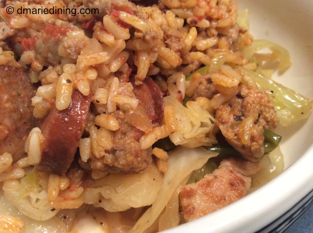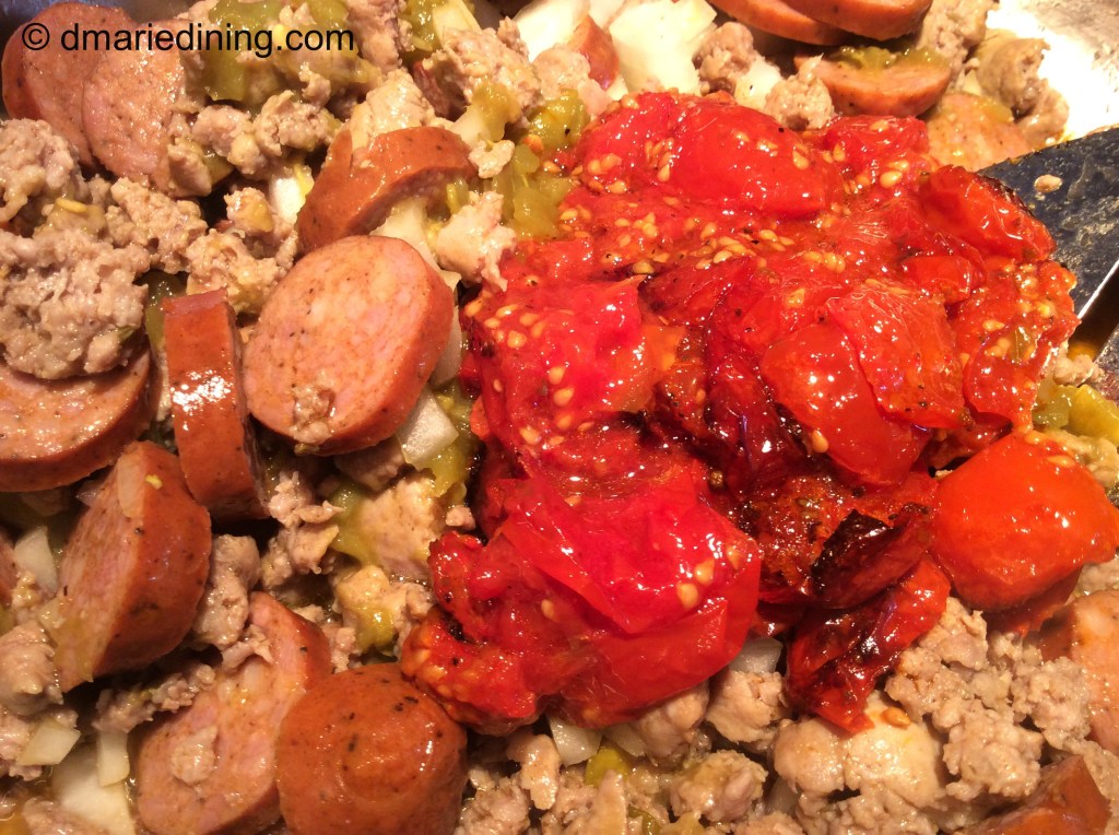 While the tomatoes are roasting brown the Italian sausage in a large skillet over medium high heat. Add sliced smoked sausage and onions to the Italian sausage and stir. Cook for 2 – 3 minutes then add the green Chiles. Cook another few minutes then stir in the roasted tomatoes and remaining seasonings. Create a well in the middle of the pan then add the box of Zatarain’s Dirty Rice. Gently mix the rice with the sausages and tomatoes then stir in water and chicken broth to blend. Reduce heat to medium and cover. Simmer for 25 – 30 minutes until the rice is tender stirring occasionally. If necessary, add a little more liquid half way through the cooking process if the rice seems hard or too dry.