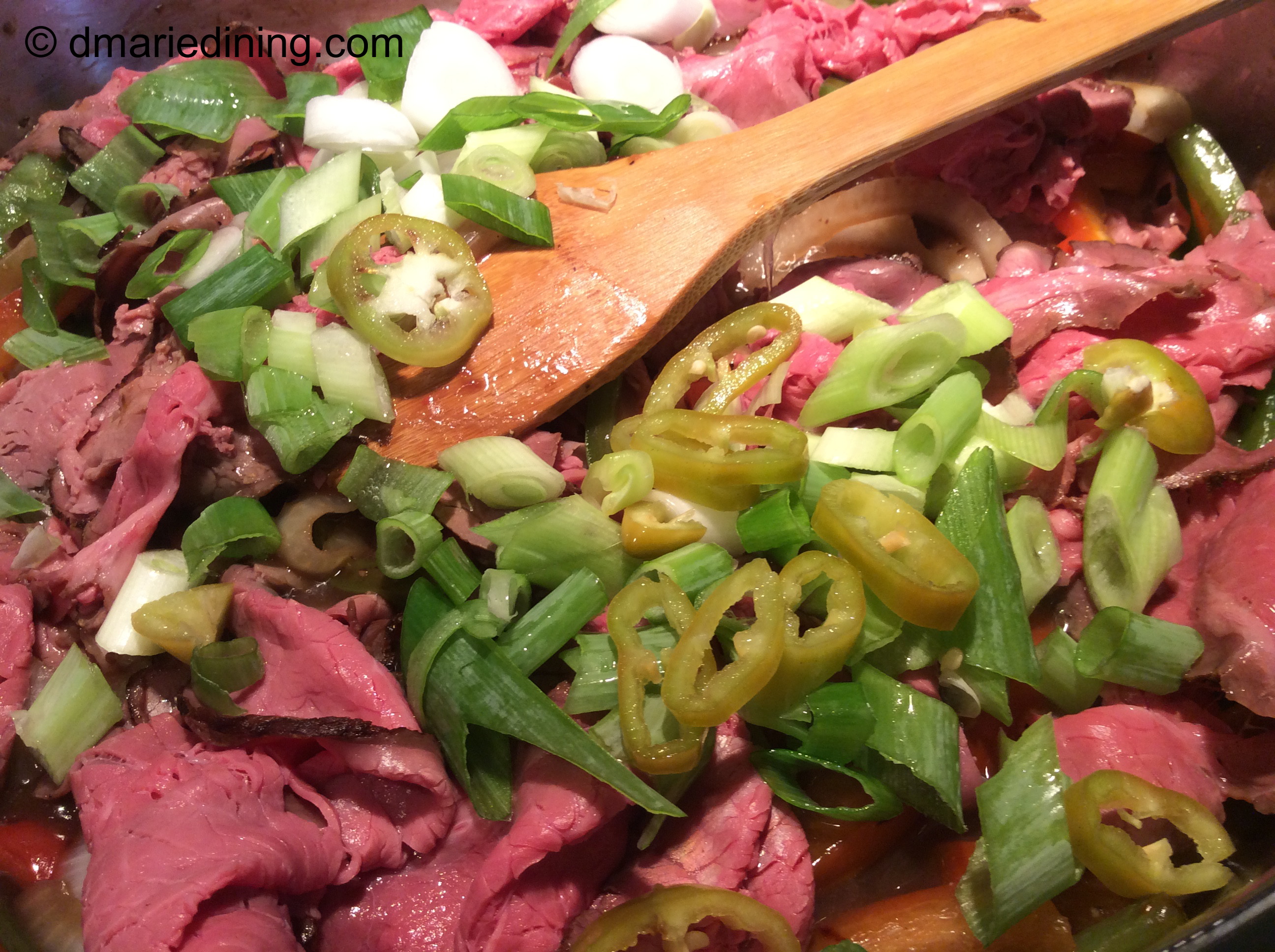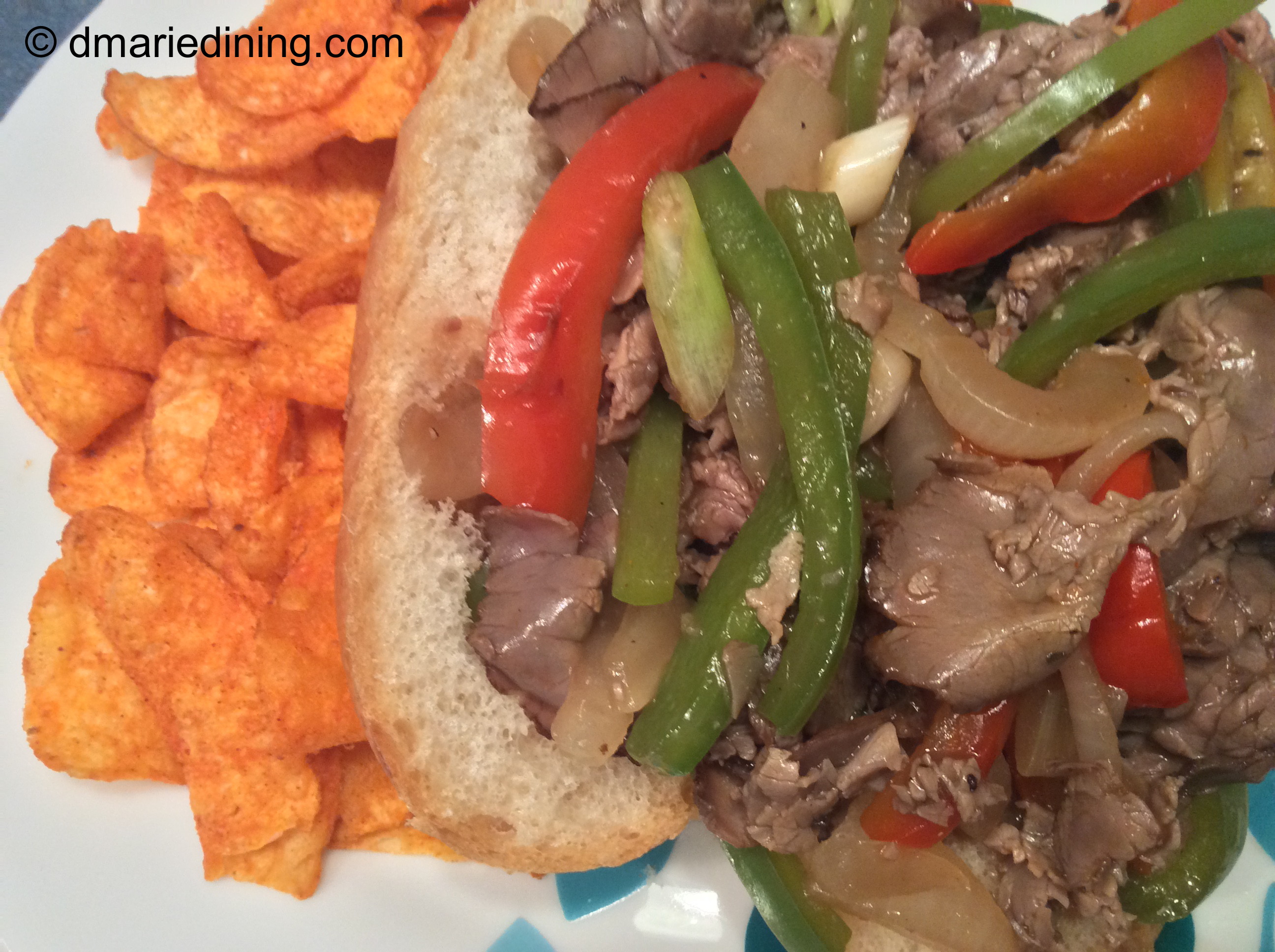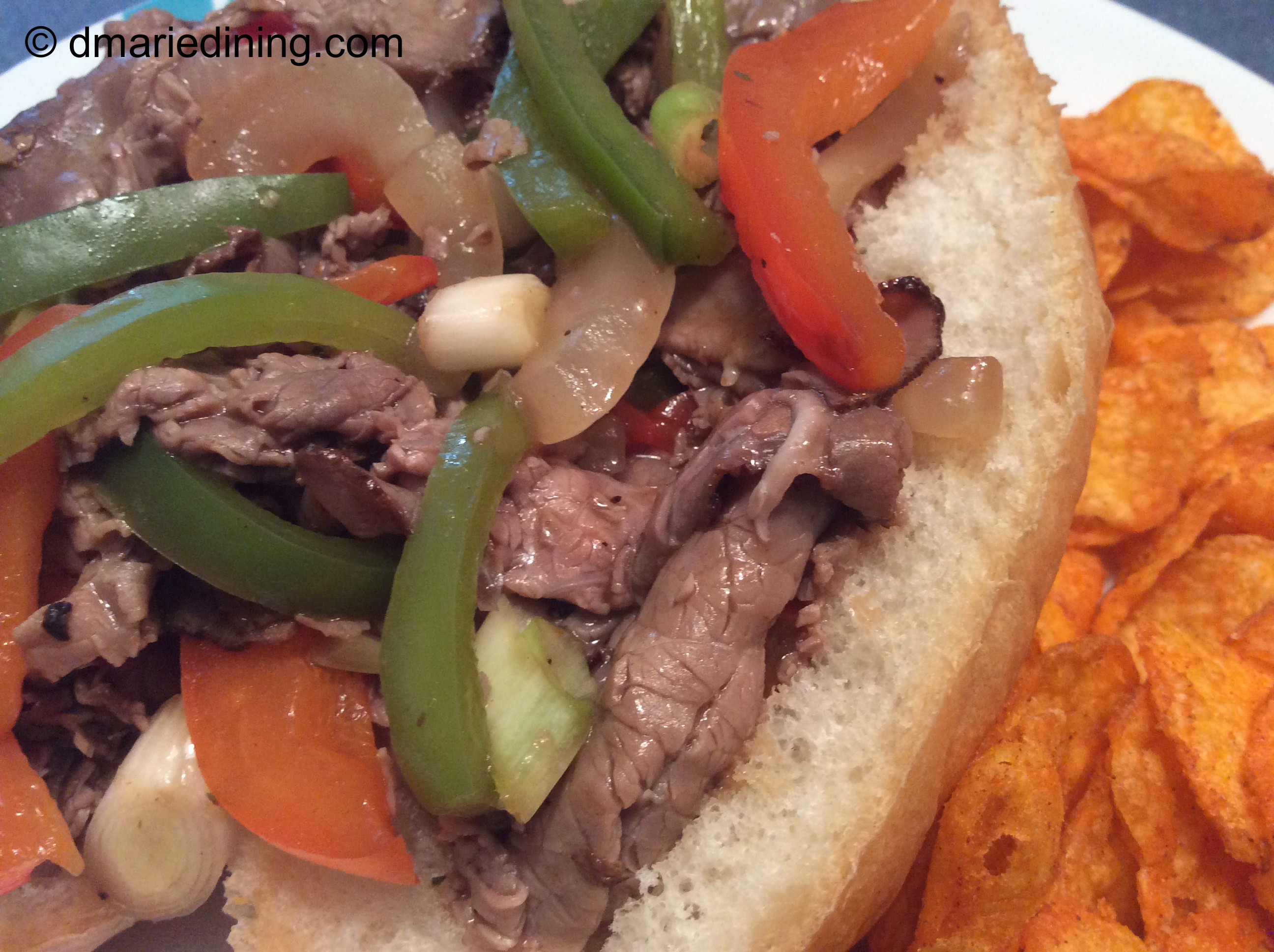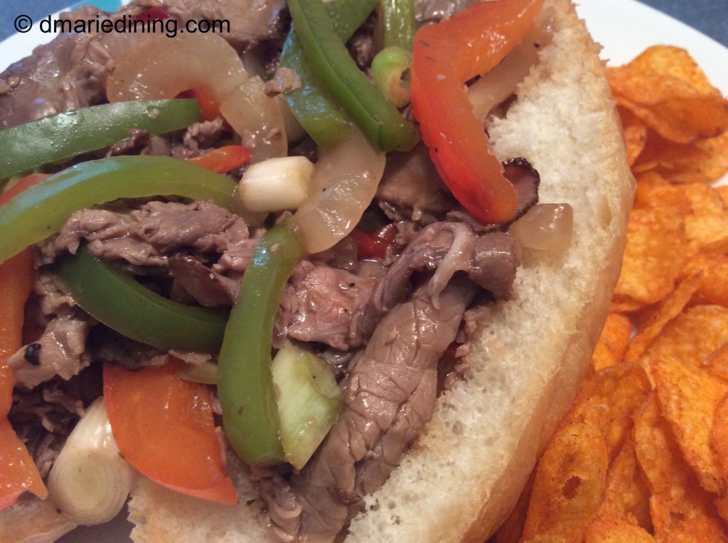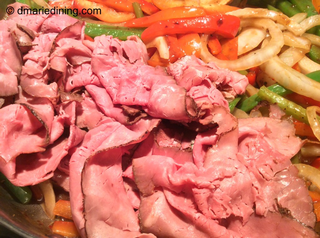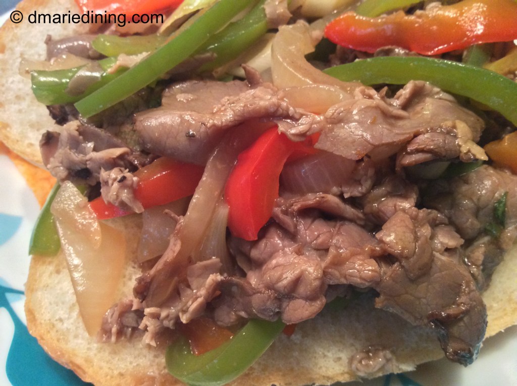 Now date night is more causal and we tend to do take out for dinner so we can sit on the porch or watch a movie. Of course, that hasn’t stopped me from enjoying London Broil. Because I have not figured out a way to make flank steak really tender, I decided to use deli sliced London Broil for an Easy Pepper Steak Sandwich. Instead of spending time marinating slices of flank steak I use thinly sliced London Broil since the meat is already tender. I just simmer the meat in a light sauce with sauteed onions and peppers to make the sandwiches more flavorful and Delicious with a capital D!