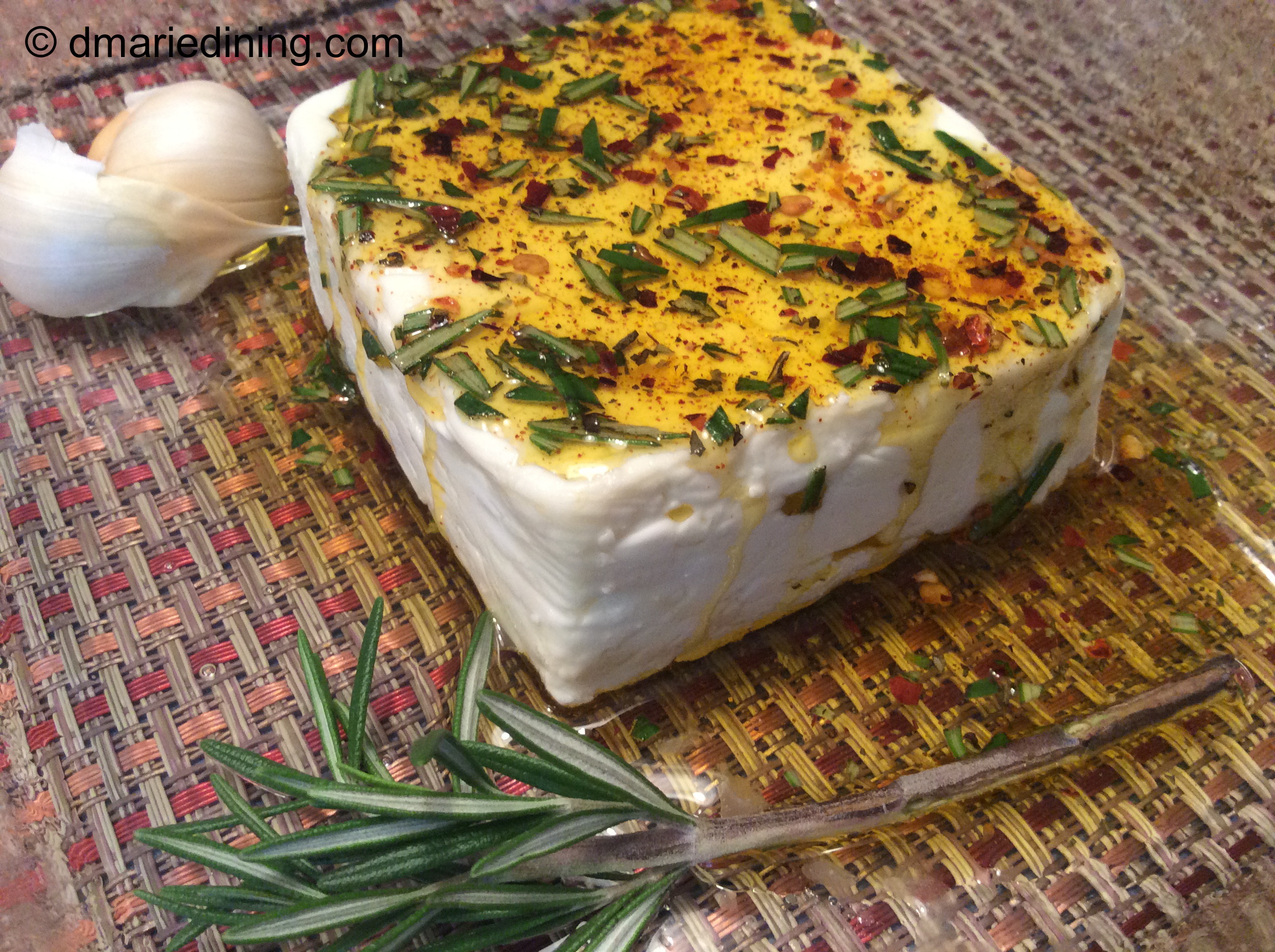 Place block of feta cheese in the center of a small baking dish and place garlic cloves in one corner of the dish. In a small bowl mix together 2 tbsp olive oil, rosemary, red pepper flakes and chipotle seasoning. Drizzle mixture over the feta cheese. Place in the oven and bake for 45 minutes until golden brown. Remove from the oven and smash the garlic. Let the cheese cool slightly.