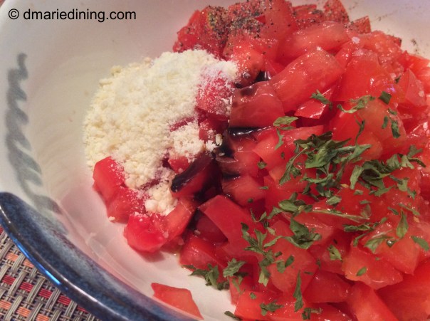 Cut tomatoes in half and remove seeds. Chop tomatoes and place in a large mixing bowl. Add ¼ cup of olive oil, salt, pepper, basil, balsamic glaze and Parmesan cheese. Stir to mix well. Cover with plastic wrap and set aside to marinate the flavors for 30 minutes.