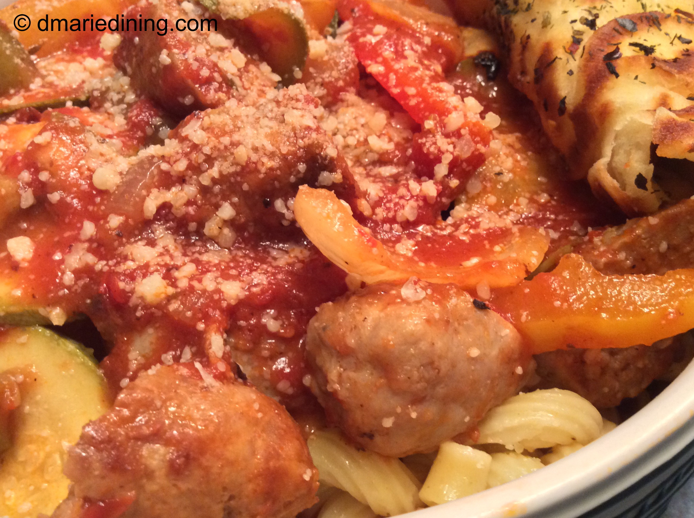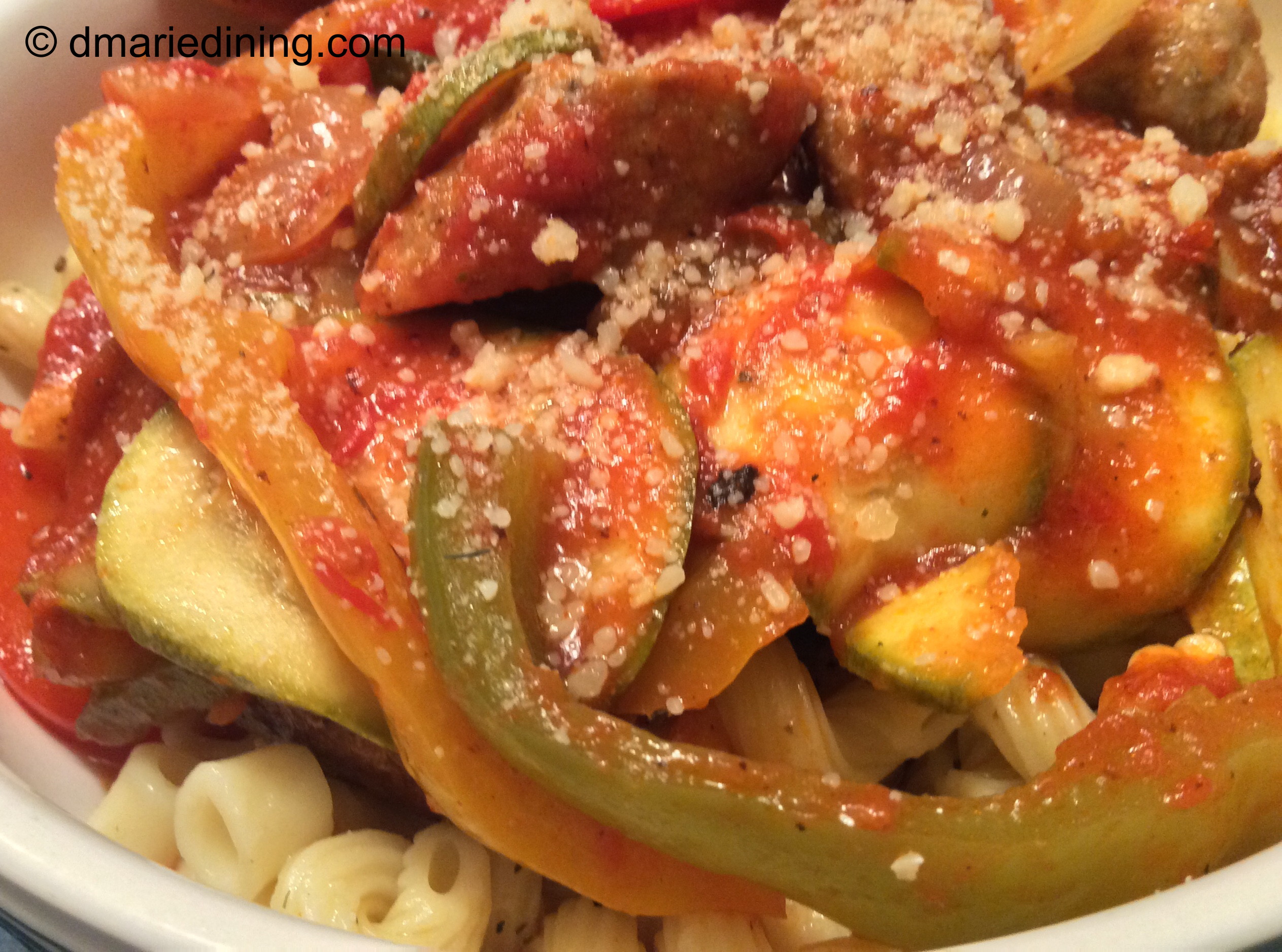 Anyway, I picked up a few along with some red, yellow and green peppers. I wasn’t sure what I was going to do with the veggies at the time but it all came together when I decided to make a quick Sunday meal. The result was a dish made of hot and sweet Italian sausage, sliced peppers, crushed tomatoes and my cute little zucchini sliced thin.