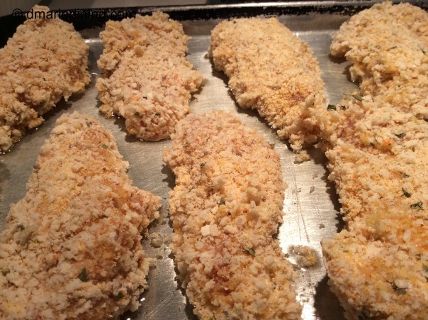 I decided to alter my recipe for Parmesan chicken by substituting chicken fingers for a full chicken breast. Thus, Parmesan Chicken Fingers was born. Using the chicken fingers allows everyone to choose exactly the right portion of meat for their appetites rather than filling their plates with a large single chicken breast.