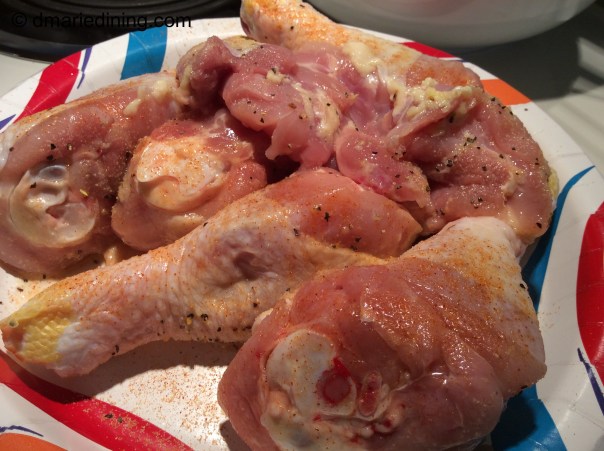 Heat oil in a large dutch oven over medium heat. Season chicken with 1 tbsp salt, seasoned salt and ground black pepper. Brown chicken then remove from dutch oven and place on a plate to cool slightly. Remove meat from drumsticks and chop or cube chicken thighs. Set aside.