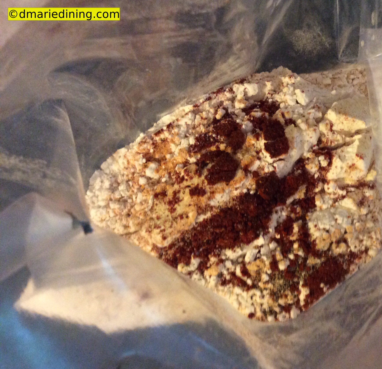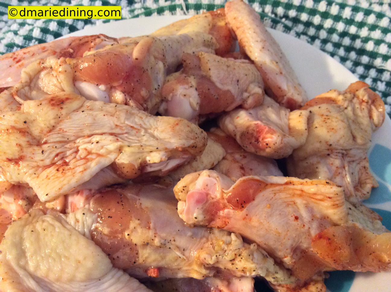 In a large bowl add chicken, seasonings and hot sauce. Mix to coat chicken. Sprinkle flour over chicken. Gradually add ½ of the water and mix the chicken. Add more water as needed until a thin paste is formed on the chicken.