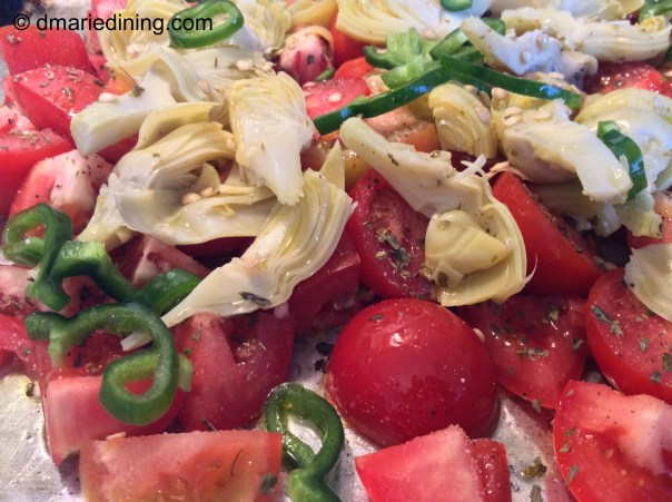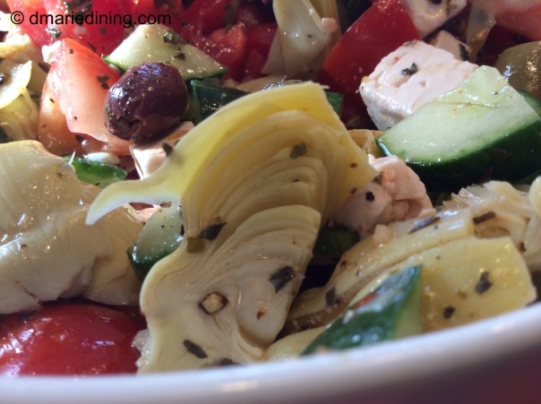 Hubby and I both like the flavor of mint in salads. I think it adds a refreshing taste to quite a few dishes. My favorite ice cream is mint chocolate chip and I love an ice cold peppermint patty. The creation of my Refreshing Tomato Salad was my welcome spring and summer gift to the family. It is packed with olives, feta cheese, cucumbers, artichokes and of course Tomatoes!