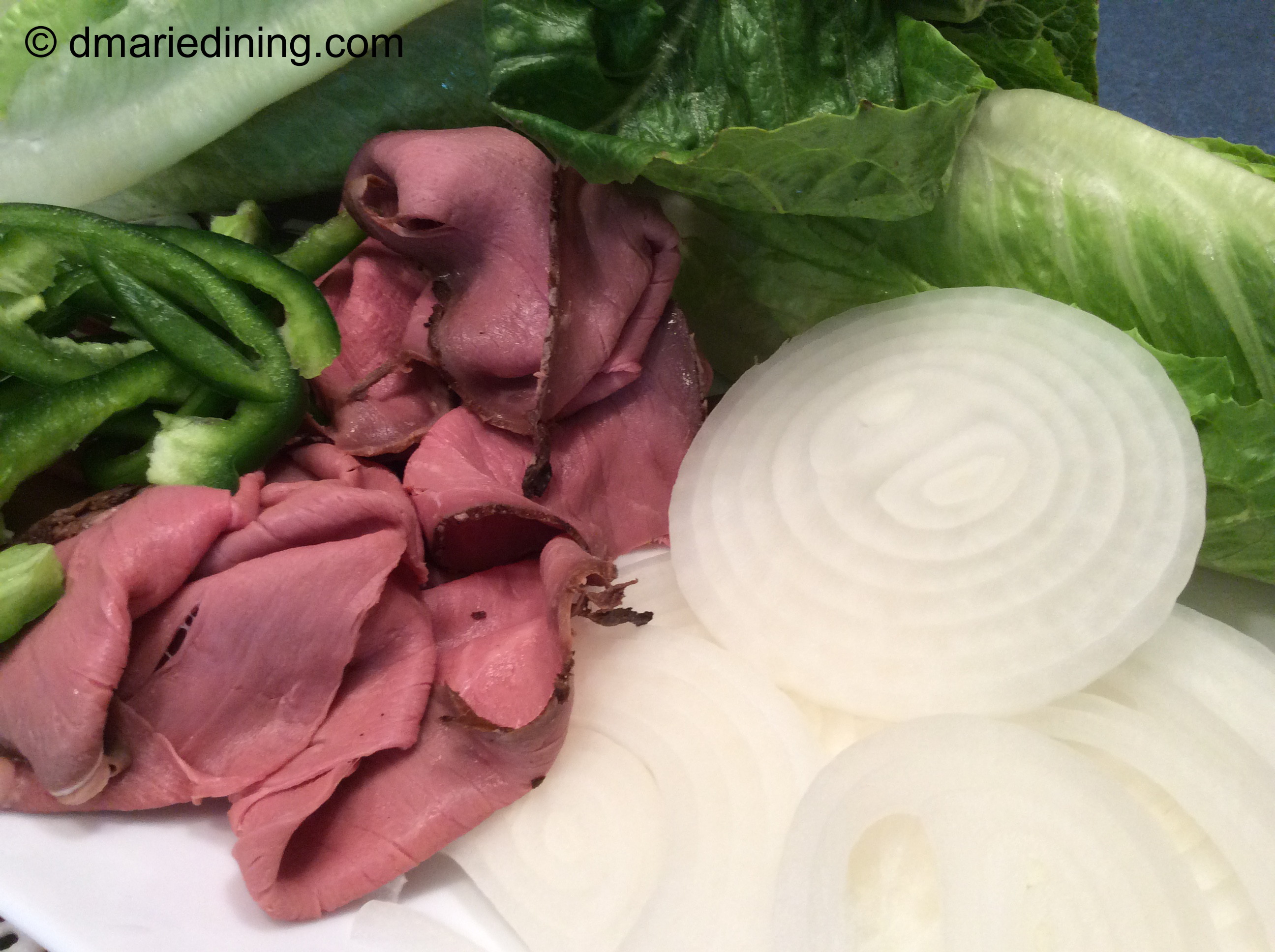 Now date night is more causal and we tend to do take out for dinner so we can sit on the porch or watch a movie. Of course, that hasn’t stopped me from enjoying London Broil. Because I have not figured out a way to make flank steak really tender, I decided to use deli sliced London Broil for an Easy Pepper Steak Sandwich. Instead of spending time marinating slices of flank steak I use thinly sliced London Broil since the meat is already tender. I just simmer the meat in a light sauce with sauteed onions and peppers to make the sandwiches more flavorful and Delicious with a capital D!
