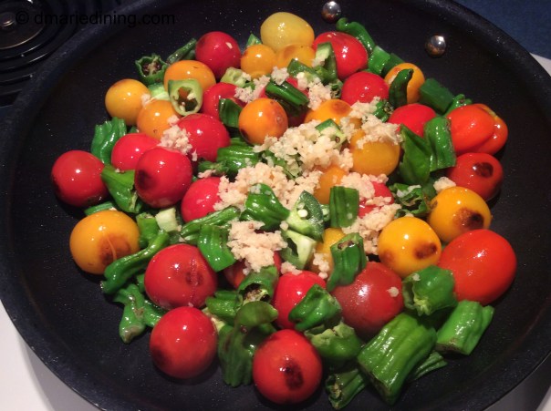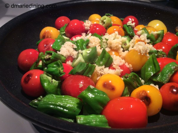 When hubby and I returned home I knew I had to find those peppers and try to recreate our wonderful appetizer. It took a few shopping trips here and there but I finally found a grocer that sold the shishito peppers. Of course I wanted to take the peppers to another level so I added blistered tomatoes to the dish because I had a garden full of cherry tomatoes. The tomatoes added an extra pop (literally) to the recipe and paired well with the peppers.